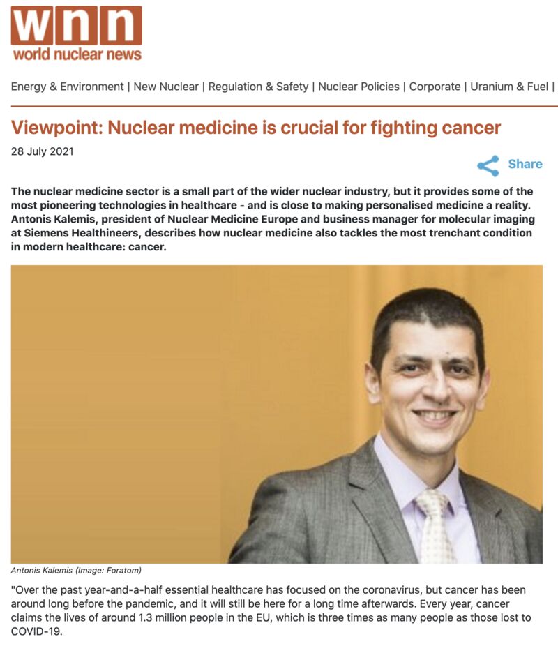 The nuclear medicine sector is a small part of the wider nuclear industry, but it provides some of the most pioneering technologies in healthcare – and is close to making personalised medicine a reality. Antonis Kalemis, president of Nuclear Medicine Europe and business manager for molecular imaging at Siemens Healthineers, describes how nuclear medicine also tackles the most trenchant condition in modern healthcare: cancer.