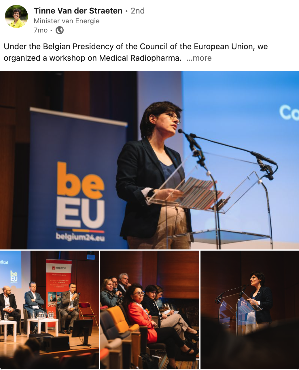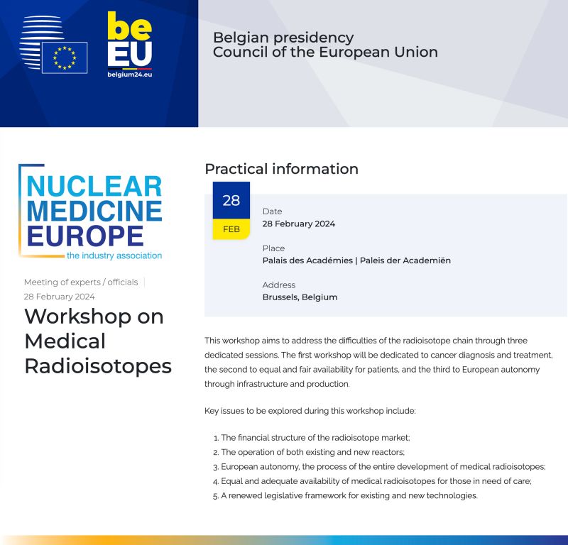 In the presence of the Belgian Minister of Energy, Tinne Van der Straeten, Nuclear Medicine Europe was invited to participate in the recent workshop “Securing Access to Radiopharmaceuticals for all European Patients”, held in Brussels. This event, held under the Belgian Presidency of the Council of the European Union 2024, brought together the key players in the field. As always, our presence served as a voice for the association’s members, advocating for a crucial issue: ensuring easier access to radiopharmaceuticals for all European patients.