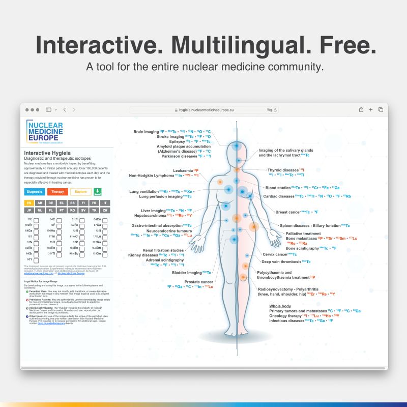 Hygieia, Nuclear Medicine Europe’s highly popular and successful data visualization tool for radioisotopes used in therapy and diagnosis, has taken a leap forward with the launch of an interactive version. This innovative platform allows users—including physicians, academics, and the general public—to customize the poster in one of 16 languages with just a few clicks.