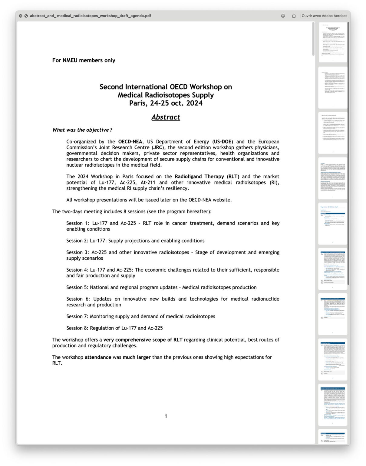 The following document is an in-depth synthesis of the Second International OECD Workshop on Medical Radioisotopes Supply, authored by Honorary President Guy Turquet de Beauregard for Nuclear Medicine Europe members. This synthesis resumes the development of secure supply chains for conventional and innovative medical radioisotopes, particularly Lu-177 and Ac-225, emphasizing Radioligand Therapy (RLT) and the potential market for these isotopes. The document also outlines the key discussions, findings, and recommendations from the whole event. All related presentations are accessible via the OECD-NEA website.