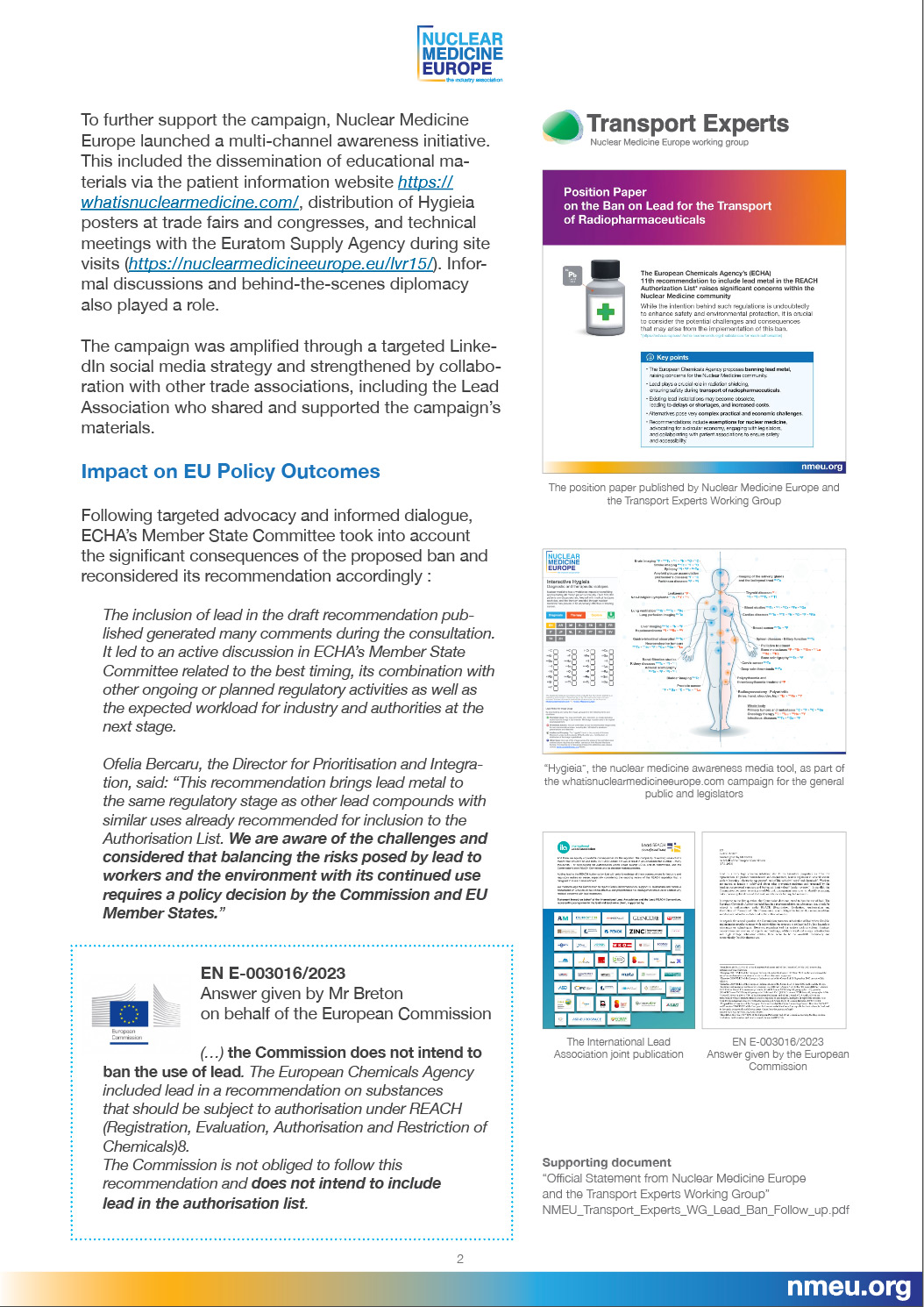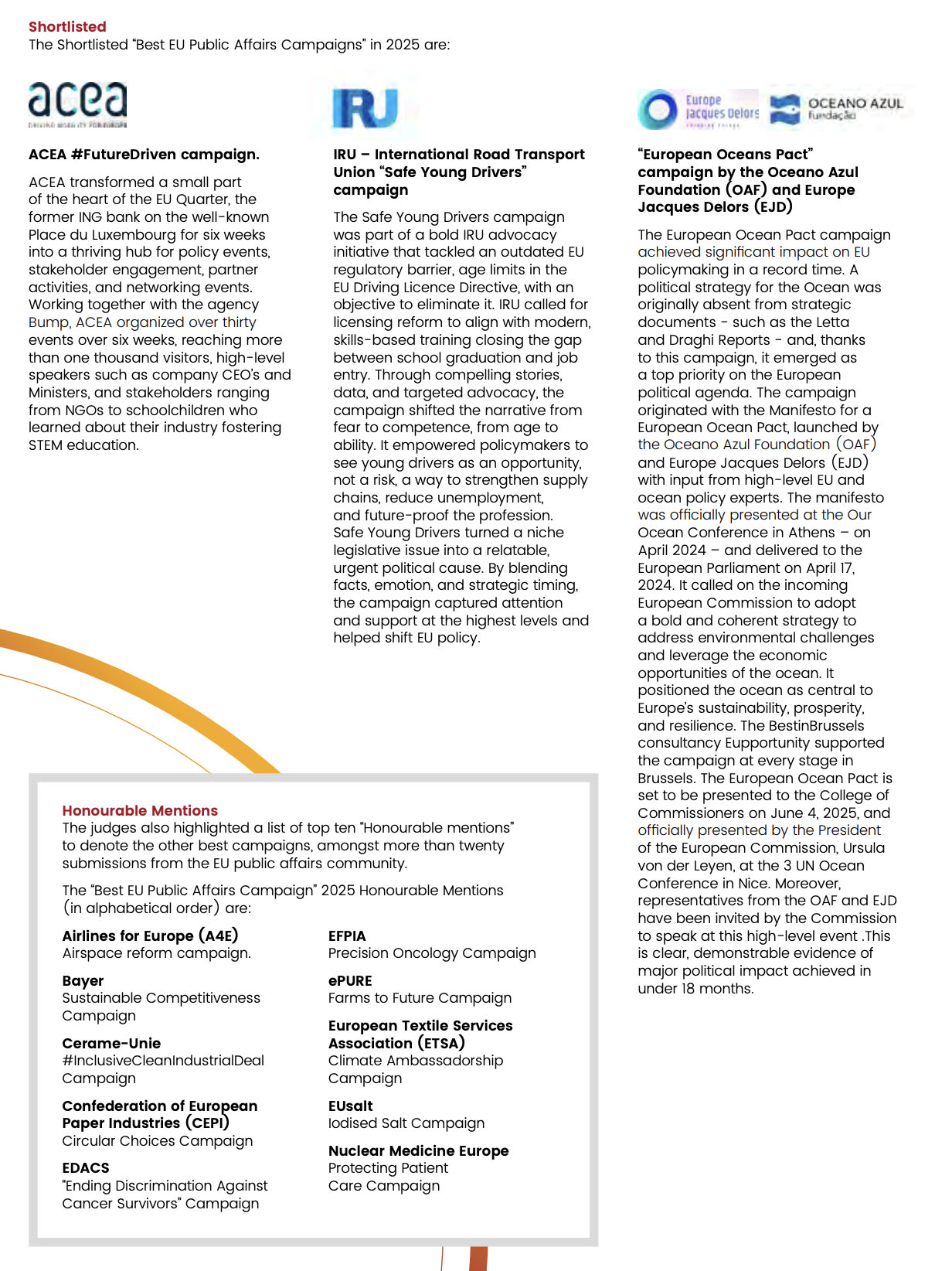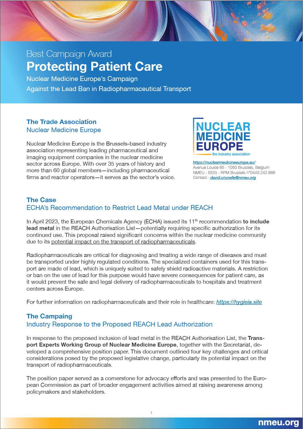 In the 2025 Best in Brussels Awards for Best EU Public Affairs Campaign, the judges published a list of the Top Ten Honourable Mentions to recognise other outstanding campaigns from the EU public affairs community. Among these, the Nuclear Medicine Europe Protecting Patient Care campaign—raising awareness about the potential lead ban—was highlighted as a notable achievement.