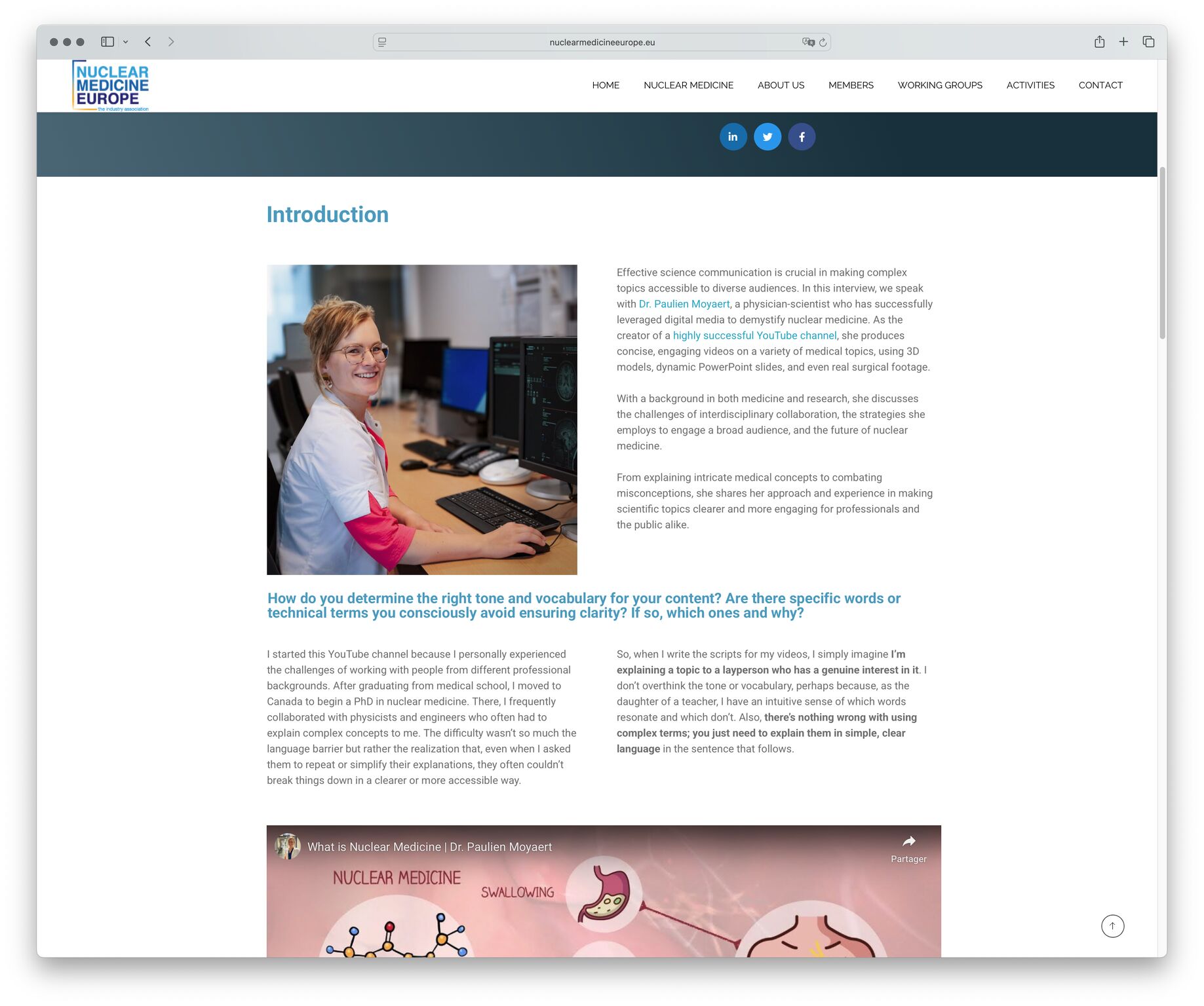 Effective science communication is crucial in making complex topics accessible to diverse audiences. In this interview, we speak with Dr. Paulien Moyaert, a physician-scientist who has successfully leveraged digital media to demystify nuclear medicine. As the creator of a highly successful YouTube channel, she produces concise, engaging videos on a variety of medical topics, using 3D models, dynamic PowerPoint slides, and even real surgical footage.